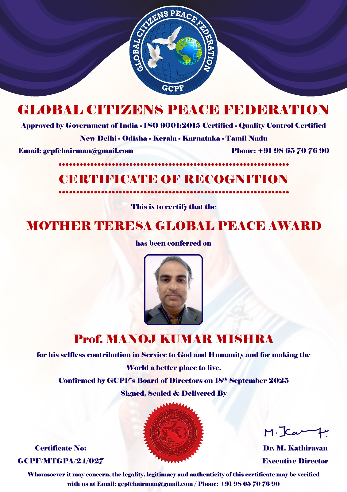 The award was officially confirmed by the Board of Directors of GCPF on 18th September 2025 and presented with a signed and sealed certificate of recognition. Prof. Mishra has been acknowledged for his tireless efforts in promoting peace, human welfare, and creating a better world for all.