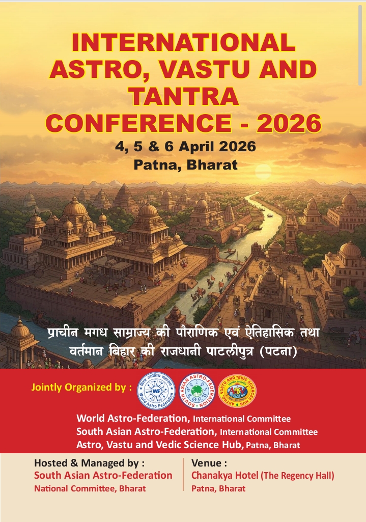 Patna, Bihar | 31 March 2026 :: The historic capital of Bihar, Patna, is set to host a significant international conference dedicated to spirituality and Vedic sciences on April 4, 5, and 6, 2026. The three-day “International Astro, Vastu & Tantra Conference–2026” will be organised at Hotel Chanakya under the joint aegis of the World Astro Federation, South Asian Astro-Federation, and Astro, Vastu & Vedic Sciences Hub.
